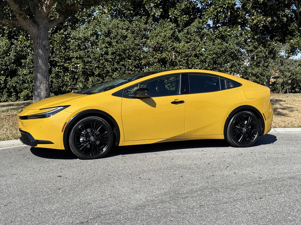 Our 2026 taxi cab, I mean Prius Nightshade, is wrapped in a hip-looking Karashi, a honey-mustard twist on taxi-cab yellow. Two other color options are available, while a black interior is standard.