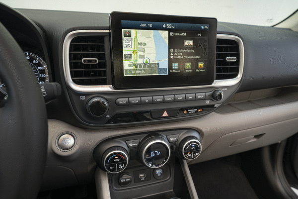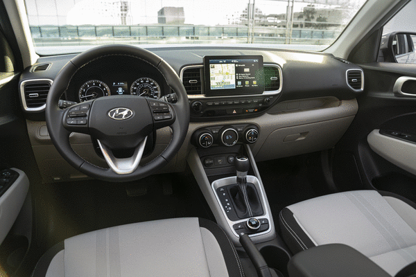 The Venue SEL supplied by Hyundai, base price $22,600, felt positively opulent, with such indulgences as wireless Android Auto and Apple CarPlay, a wireless phone charger, front and rear USB ports, automatic climate control, tilt/telescopic steering wheel, express-down power driver’s window, heated front seats, steering-wheel-mounted audio and cruise controls, leather-wrapped steering wheel and shift knob, heated side mirrors and a rear cargo cover. It even had a blue and white exterior that proved to be quite fetching.