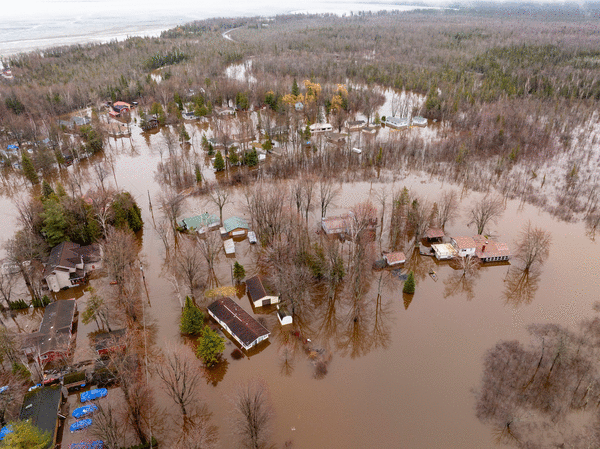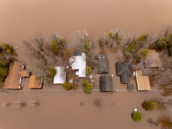 Drone footage taken along the river shoreline Thursday shows dozens of homes swamped by water on all sides.